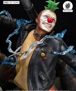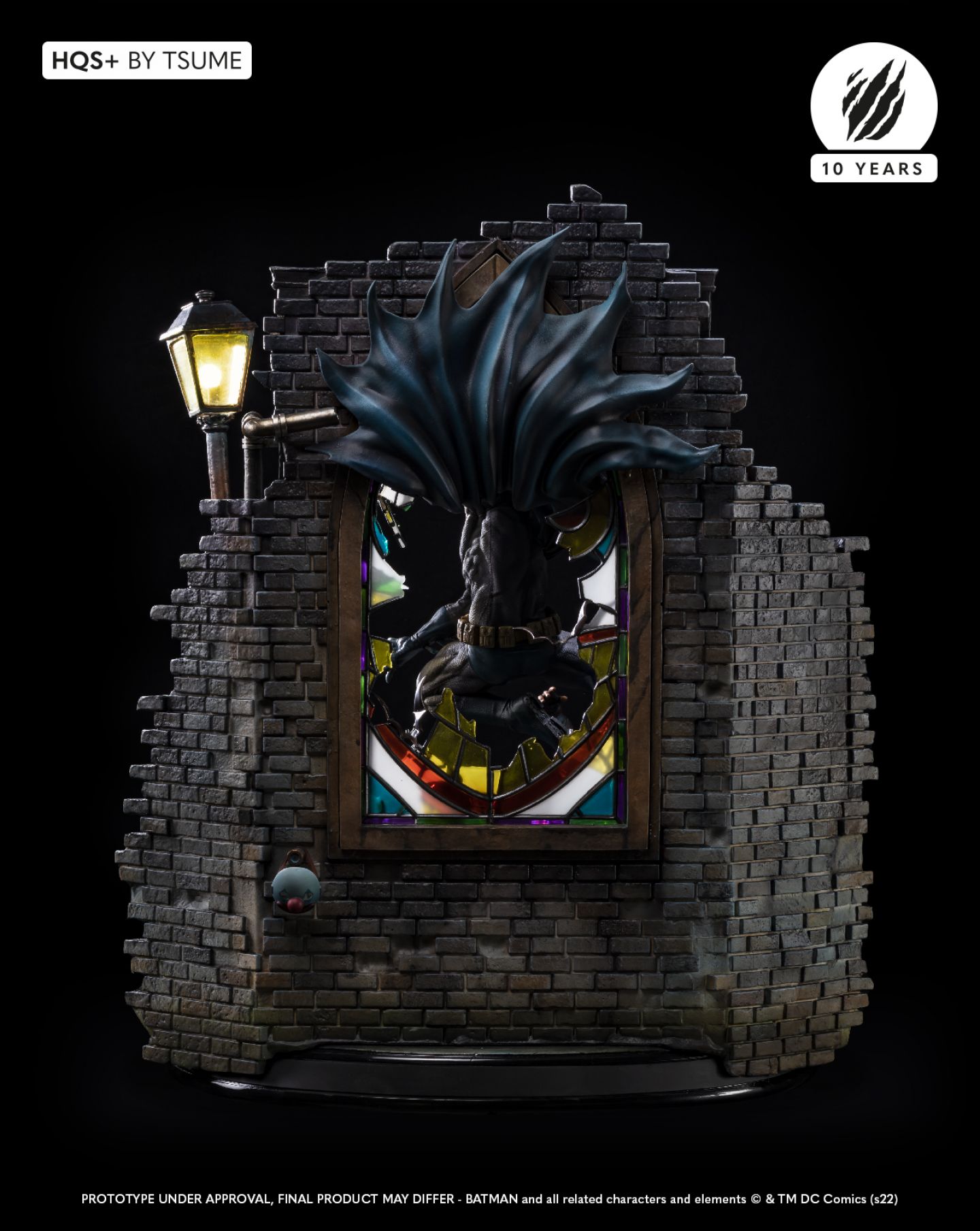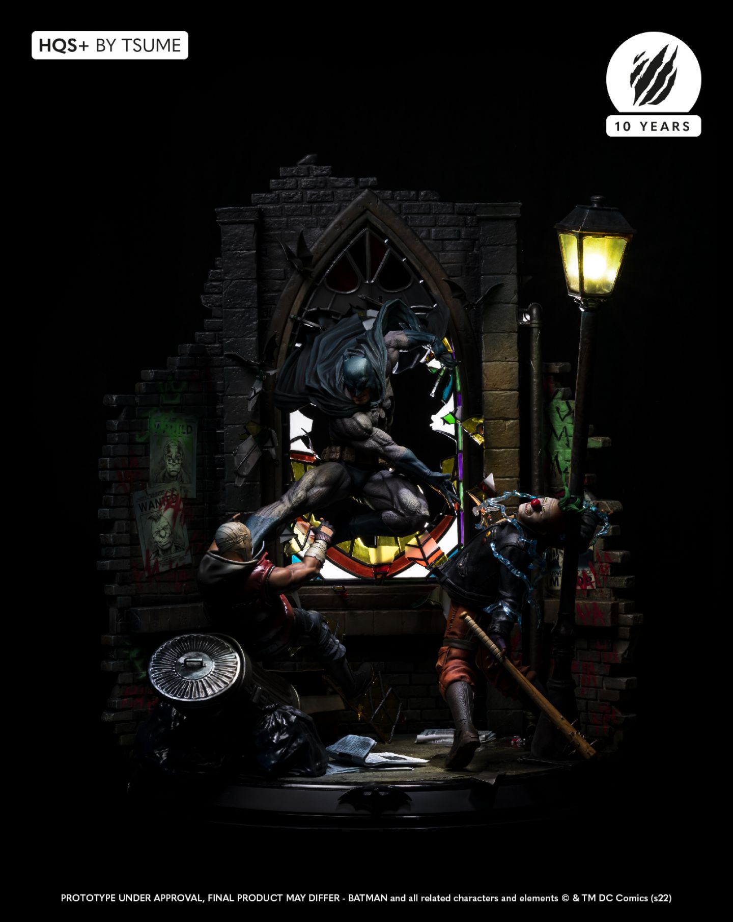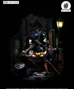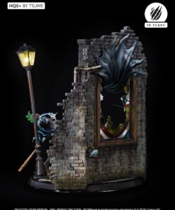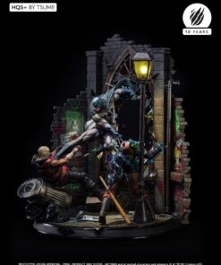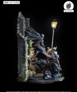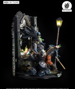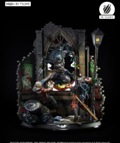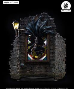 Succumb to the sweet madness of the DC Comics universe as you roam the darkest streets of Gotham city, watched by a certain Caped Crusader: Batman HQS+ by Tsume! We see here the Dark Knight pouncing on two delinquents, crossing a stained glass window inspired by the Ultimate Comics Batman # 50 Cover, representing the portrait of his worst opponent, as the clownish make-up of the two attackers is claiming their affiliation with the infamous Joker! Batman wears his legendary fear-inspiring costume in kelvar and dark cape in nomex to roam the Gotham slums. His pointed-eared mask conceals his identity as he proudly displays the mythical bat symbol on his chest. Devoid of superpowers, his strength lies in his intelligence and great mastery of martial disciplines completed by the use of cutting-edge technology gadgets. Taking flight, Batman swoops down on his prey and throws it violently into the trash cans, while his crime companion is electrocuted by a batarang … He will end his race in an offside position, crushed on the lamppost, only light in darkness … Every detail of this scene holds us back in this dark universe, especially the « smile » graffiti on the red brick walls, the wanted posters of the two delinquents plastered by the police department, the headlines of the Gotham Gazette or Gotham Globe, the municipal election posters bearing the effigy of the ambitious Oswald Cobblepot, the black bat on the front of the plinth, or just a mask hanging there, probably waiting for the right face … As you can well imagine, the Joker is approaching dangerously, ready to retrieve what belongs to him!