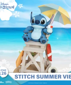 For fans of the endearing Stitch, join him as he enjoys a leisurely day at the beach, captured in a fun and sunny figurine. This piece promises to bring a slice of Hawaiian paradise to your collection.