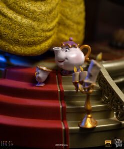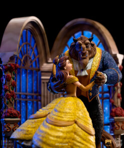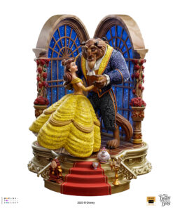 With a curtain of stars decorating the big stained-glass in the background, and big branches of roses sprouting from marble columns that climb in tendrils, a bestial creature with brown fur, horns, claws, and a tail, wearing formal noble attire, gently conducts a romantic dance with a beautiful young woman with long brown hair. Over a set base that reminds the ballroom of his palace, with the stairs and red carpet in the front, where the peculiar couple is observed by Lumiere, the castle’s charismatic but rebellious footman, transformed into a candelabra, followed by the butler Cogsworth, transformed into a clock, and the housekeeper Mrs. Potts, and her son Chip, transformed into a teapot and a teacup respectively, with the entire base decorated. Adding to the line that celebrates Disney’s centenary, Iron Studios present the statue “Beauty and the Beast Deluxe – Disney 100th – Disney Classics – Art Scale 1/10”, inspired by Disney’s 30th animated film of theater musical, based on the fairy tale La Belle et la Bête by Jeanne-Marie Leprince de Beaumont.