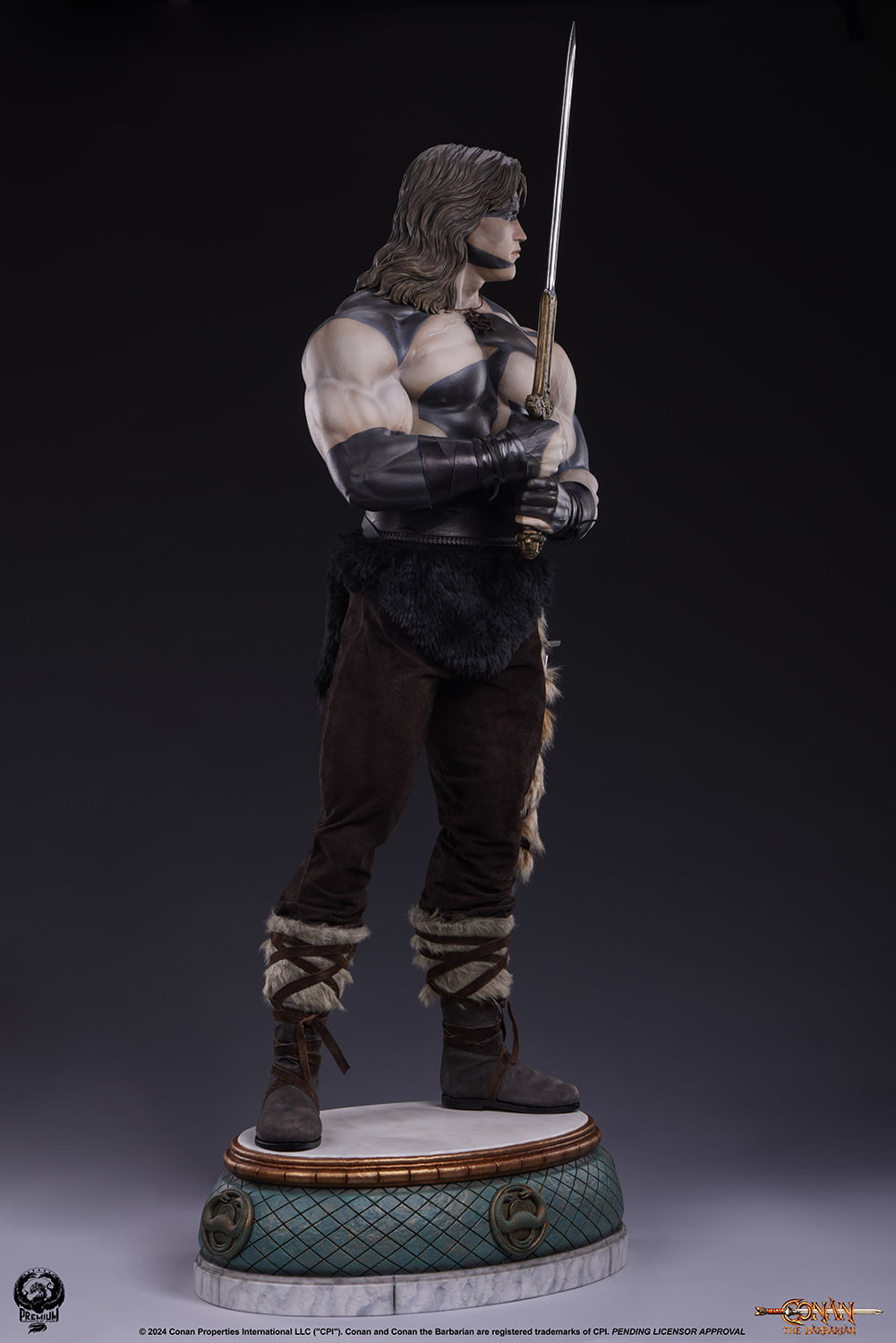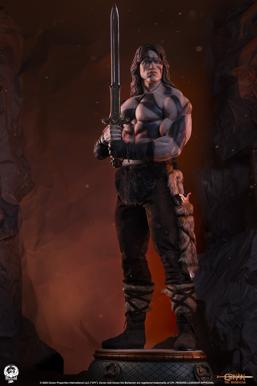 Standing at a staggering 46” tall, this is the definitive Conan the Barbarian statue. Featuring an uncannily accurate portrait of Arnold Schwarzenegger in his iconic role, this collectible brings the Cimmerian warrior to life as never before. The Conan 1:2 Statue features a costume masterfully crafted in real fabric including pants, gauntlets, boots with faux fur trim and a faux fur covered sheath at his hip.