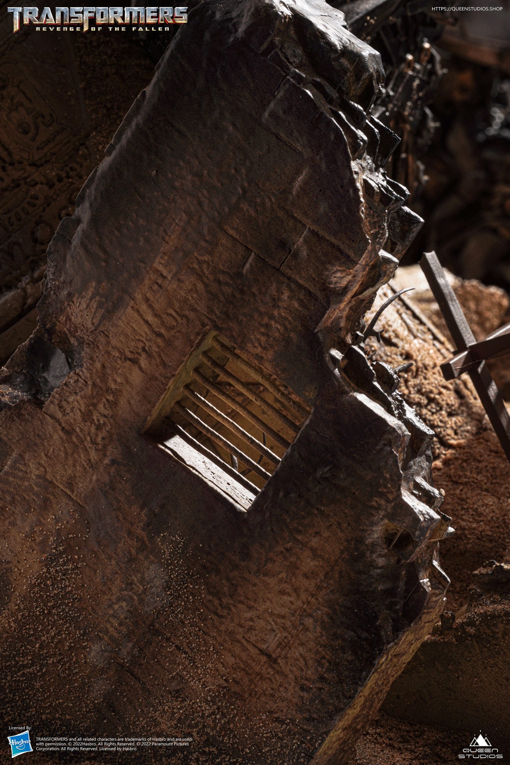 The design of the base is inspired by the pyramid seen in the final battle during the second Transformers movie. The collapsed stone pillars and pyramid walls of the base highlight the chaos create through Optimus Prime and Megatron’s feud, but also creates an overall sense of space and gives a further realistic aesthetic to the statue. Megatron has a total of 4 LEDs installed, two red eyes, a light blue LED underneath a pair of vents on the back, and a single light blue LED in his hand muzzle; Optimus Prime has one set of light blue LEDs in his eyes.