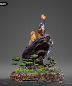 On the Pride Lands, in Africa, hundreds of animals gather around the Pride Rock, a pulpit of rocks used by the ruler to answer the pleas of his subjects and for celebrations. For everyone present there, Rafiki, the wise shaman Mandrill, advisor to the kingdom, raises in his hands, presenting to the animals gathered there, the small Simba, newborn prince cub, heir of the Kingdom. Right behind, his parents, the proud king Mufasa and queen Sarabi, followed by their butler, the Hornbill bird Zazu. Replicating one of the most striking scenes from the 32nd Walt Disney Animated Classics animated feature film, Iron Studios present the statue “Lion King Deluxe – Disney Classics 100 Years – Art Scale 1/10”, another awarded classic, selected to be preserved in the National Film Registry by the U.S. Library of Congress for being culturally, historically, or aesthetically significant, adding to their line of statues celebrating the 100 years of Disney by Iron Studios, over a diorama base richly decorated with trees and vegetation of the plains in which the scene takes place, surrounded by tribal drawings and symbols from the movie in a side surface that resembles the texture of wood.