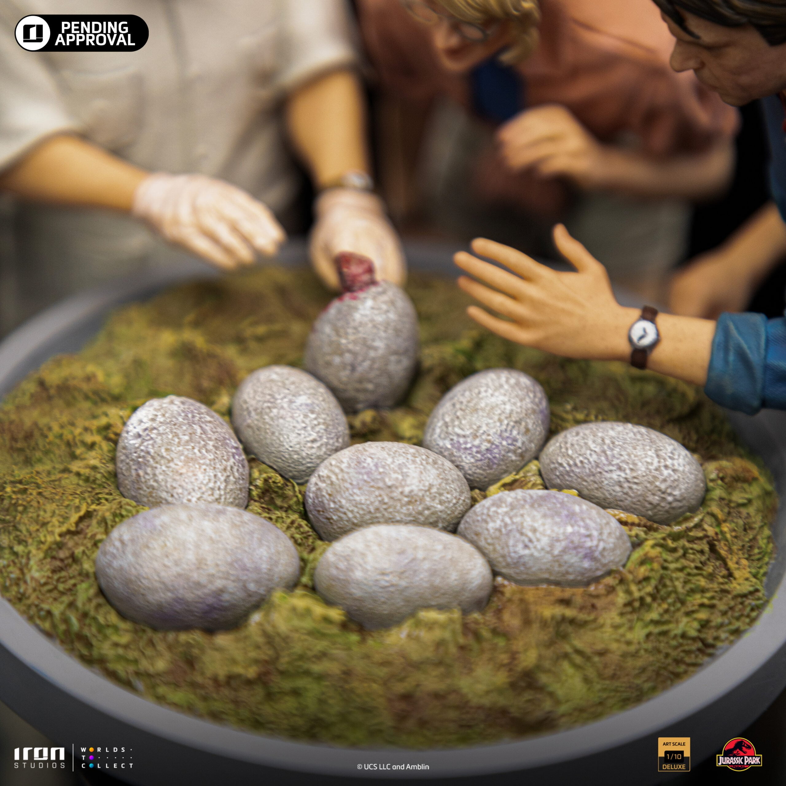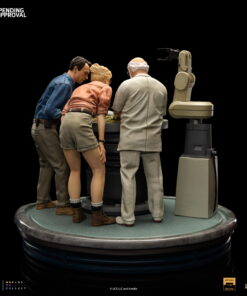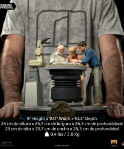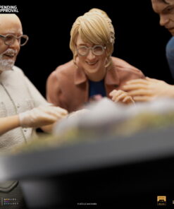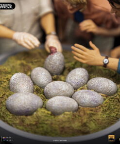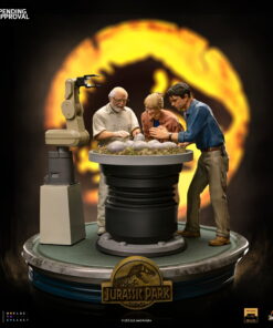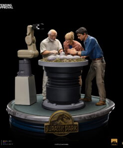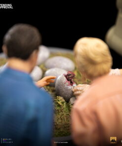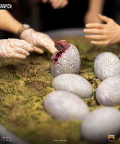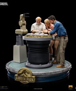 Smiling like a zealous father, the CEO of InGen and the creator of Jurassic Park with gloved hands helps in the birth of other cloned dinosaurs in his laboratories. The moment the hatchling breaks the shell of his egg in the hatchery. By his side, witnessing this miracle of life and science, a paleobotanist smiles, fascinated, and her partner, a respected paleontologist, gets surprised when finding out which is the species of the animal! Presented on Iron Studios’ booth at San Diego Comic-Con 2023, the diorama statue “Dino Hatching Deluxe – Jurassic Park – Art Scale 1/10” replicates one of the most sublime and emotional moments from the original movie from 1993, with John Hammond, Ellie Sattler, and Alan Grant watching the birth of a Velociraptor in their schedule tour in the park. Meticulously portraying the facial features of actors Richard Attenborough, Laura Dern, and Sam Neill, just like the details of the set like the hatchery and the robot arm baby-sitting the eggs.