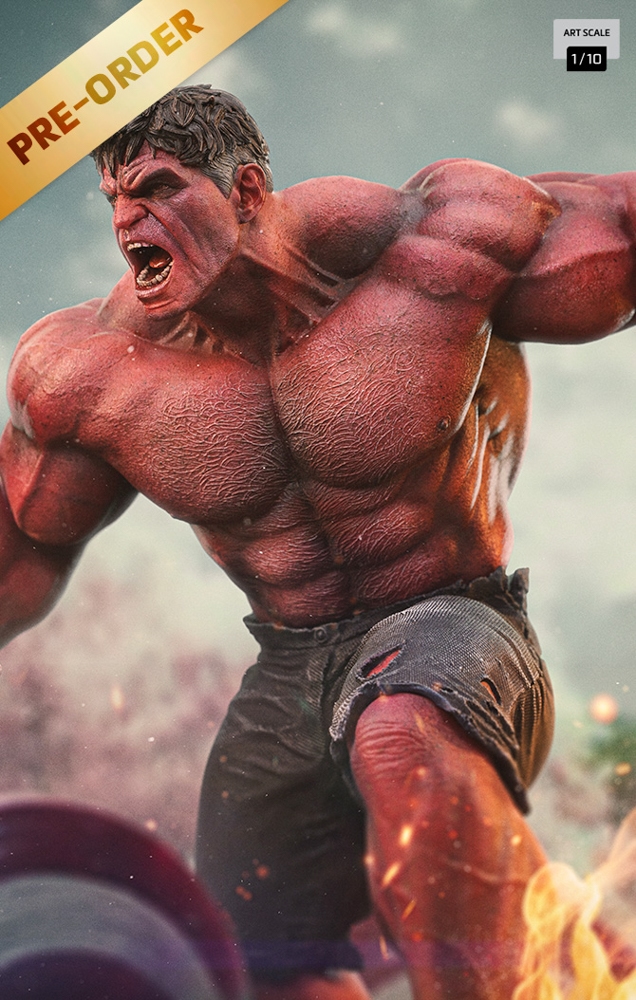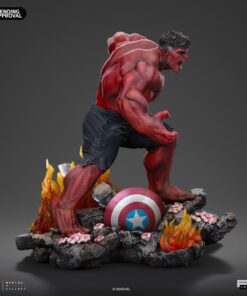 The statue captures the aftermath of his transformation, with the tattered remains of black pants clinging to his muscular frame. Every detail, from the veins bulging on his arms to the texture of his torn clothing, is meticulously sculpted and hand-painted to bring Red Hulk to life.