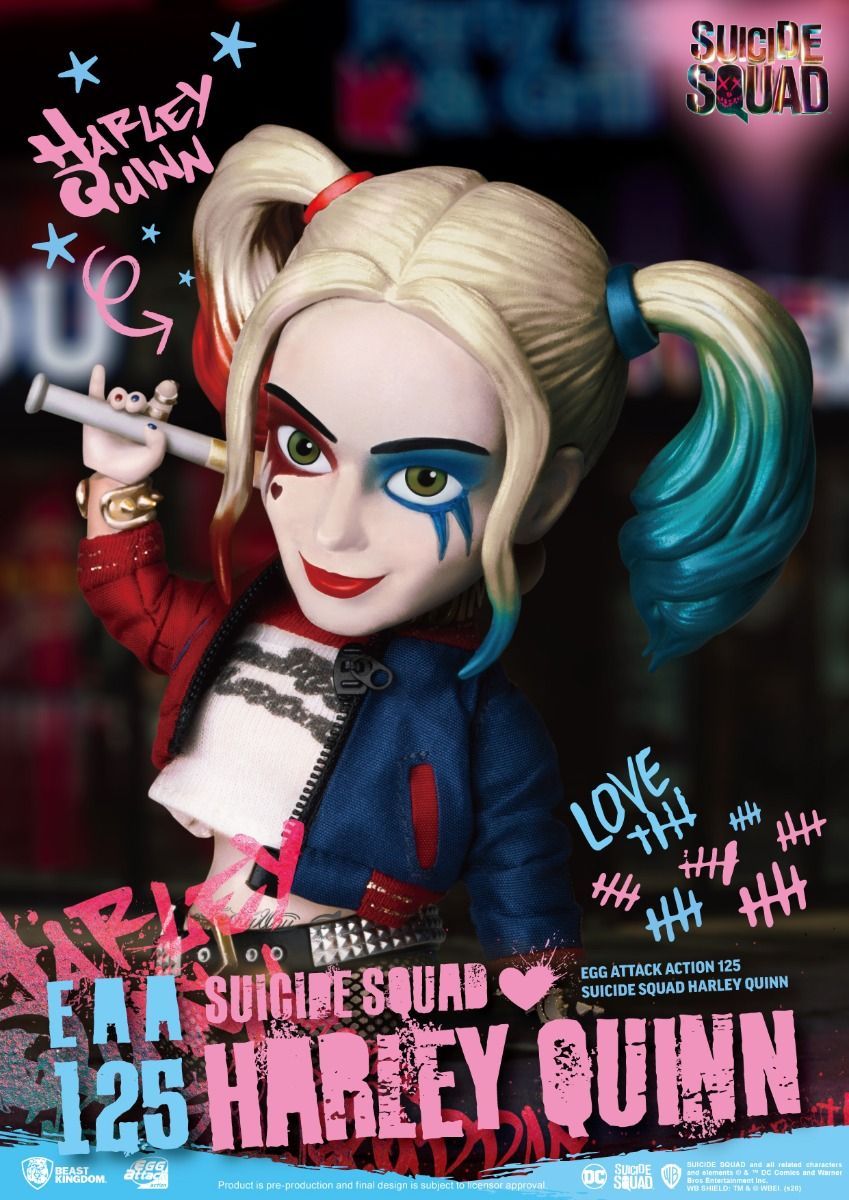 Beast Kingdom, ‘The Entertainment Experience Brand’ is once again proud to introduce the EAA-125 Suicide Squad: Harley Quinn (Egg Attack Action) from the series of 6-inch, highly articulable action figures. Starting with the meticulous focus on design, the two replaceable faces sculpts are quintessential ‘Harley’, with her pale skin and zany looks! The use of real cloth in the outfit provides collectors with a high-quality design to match the EAA stylized look! From the tiniest details such as the print of ‘Daddy’s Lil Monster’ on her t-shirt to the now-famous ‘Pudding’ printed blue and red bomber jacket, with real working zip, as well as the punk style hot pants and fishnet stockings, nothing is left out. The bevy of accessories also adds a great number of ways for posing the figure. Five pairs of replaceable hands and one additional right hand, with jewelry and gloves, as well as the famous pistol, baseball bat, mallet, and even replaceable bracelets, allow for the ultimate in customization. Topping the set off with a figure base and bracket, this Harley Quinn EAA figure is ready to put a big smile on any collector’s face. So, make sure to grab her today and cause some mayhem on a desk near you!