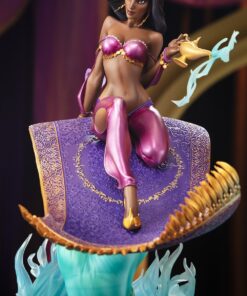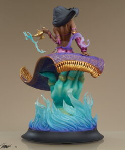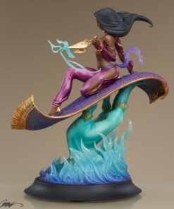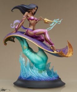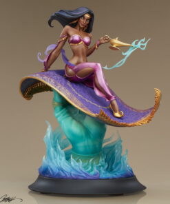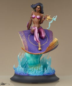 The polystone Sultana: Arabian Nights Statue measures 17.4” tall x 11.8” wide x 15.3” deep, depicting the ravishing royal on an enchanted carpet ride across the night sky. She holds a golden magic lamp, unleashing an all-powerful genie whose hand carries her on the breathtaking journey. The statue’s base is ringed in mystic blue and purple flames as the supernatural spirit emerges, creating a captivating scene from top to bottom as inspired by J. Scott Campbell’s original illustrations.