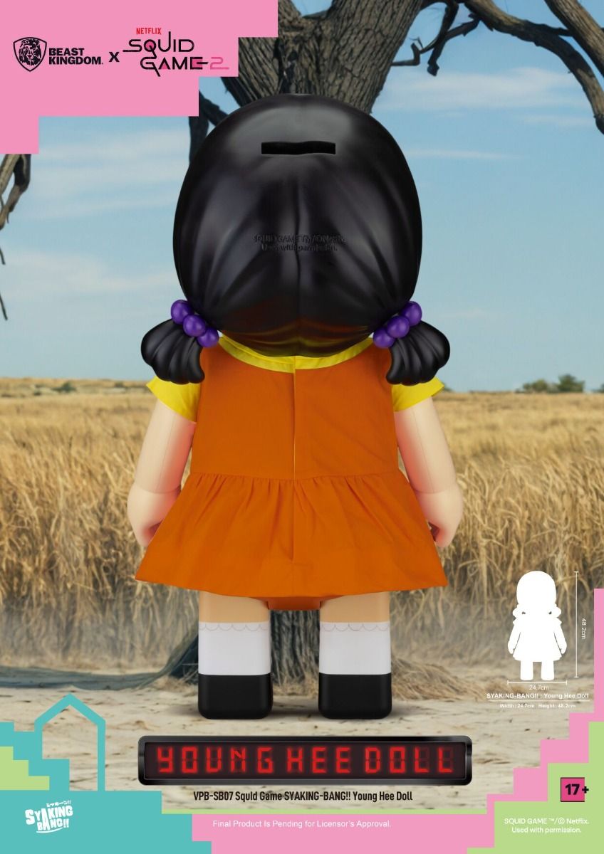 Beast Kingdom’s new “Squid Game SYAKING Piggy Bank – Young Hee Doll” turns this giant robot into a cute, large, articulated piggy bank! With movable limbs and a 360-degree rotating head, it captures the eerie countdown effect from the show. The doll’s fabric costume faithfully recreates its on-screen look, with rosy cheeks and innocent eyes, making it hard to decide whether it’s adorable or terrifying. Hurry, drop in your coins to avoid the Squid Game fate!